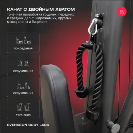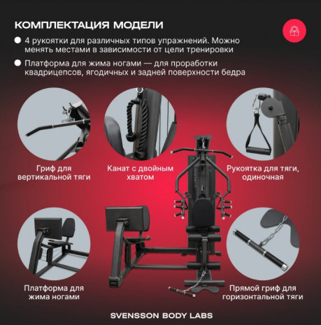 SVENSSON BODY LABS RIGEL PLUS PRO представляет собой высококачественный силовой комплекс, сочетающий в себе профессиональное качество, многофункциональность и комфорт использования. Идеально подходит как для коммерческих фитнес-центров, так и для домашних тренировок.
