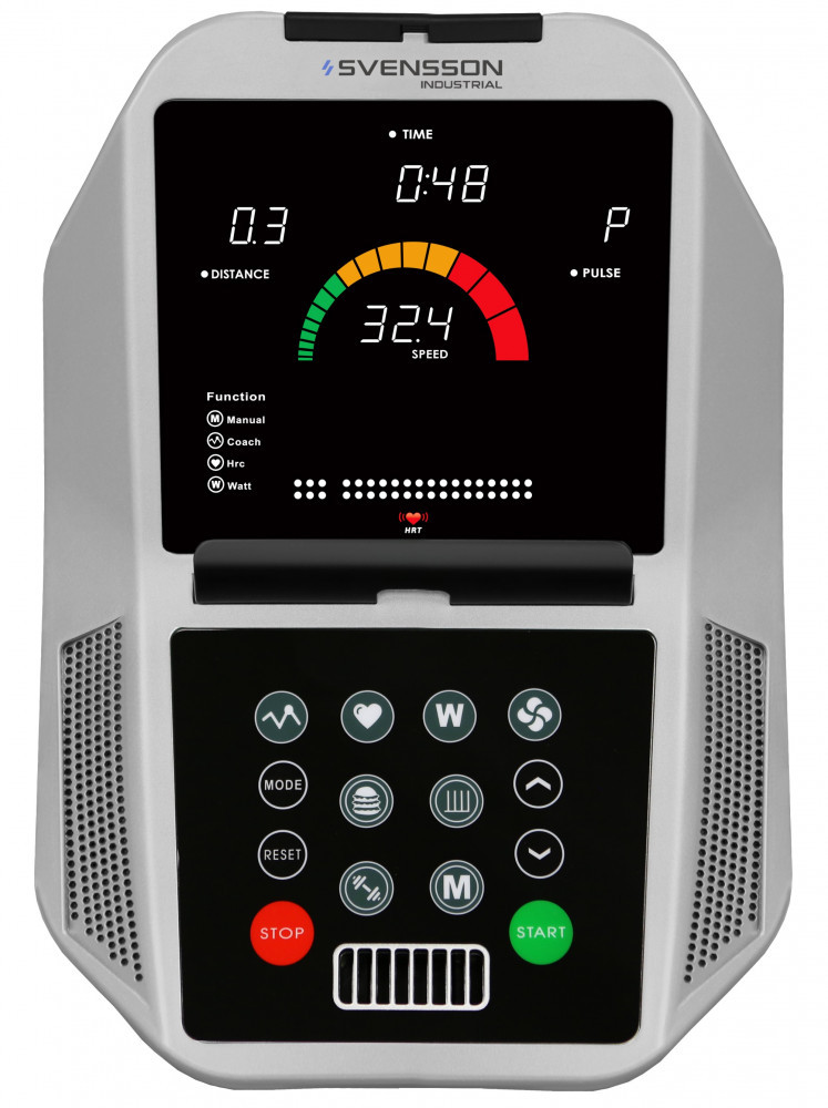 На тренировочном компьютере расположен профессиональный дисплей. Для работы основного экрана использованы светодиоды (LED), 4 дополнительных функционируют на жидких кристаллах (LCD). На экране компьютера можно всегда ознакомиться со всеми показателями тренировки: скоростью, пройденным расстоянием, затраченными калориями, количество оборотов в минуту и др. На одной из клавиш, расположенных на консоли были выведены 3 режима, предполагающих проведение тренировок с высокой интенсивностью.