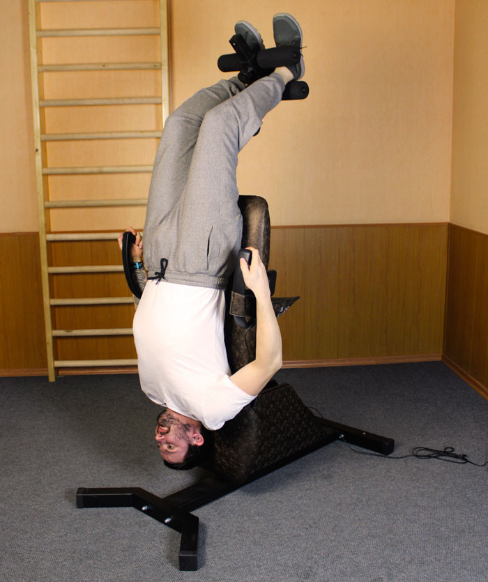Гравитационный тренажер позволяет разгрузить позвоночник и мышцы, так как упражнения на нем выполняются в положении вниз головой.