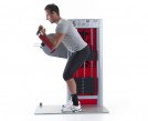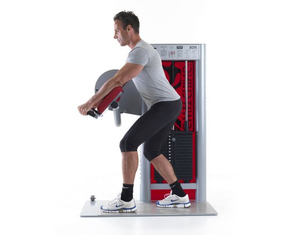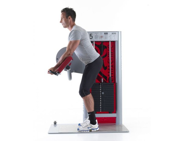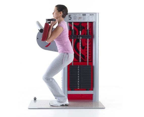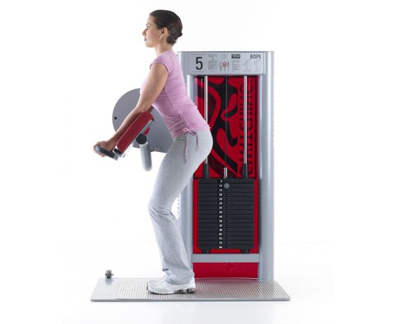 При выполнении упражнения на бицепс руки согнуты в локтях вверх, а одна нога располагается немного перед другой. За счет естественного положения рук запястья не испытывают чрезмерных нагрузок. Упражнение на силовом тренажере SW05 бренда Teca можно видоизменять, выполняя его, стоя на одной ноге.