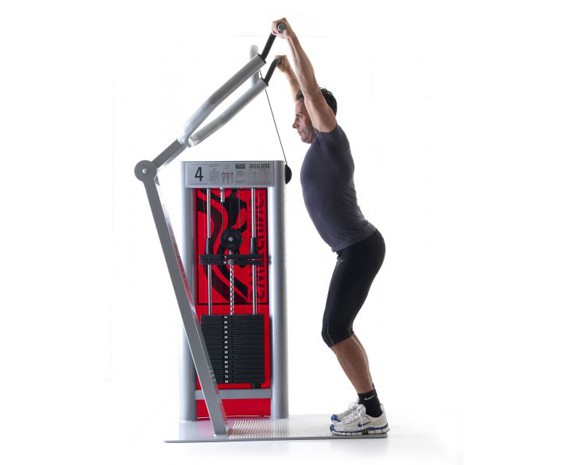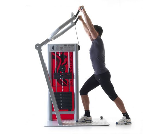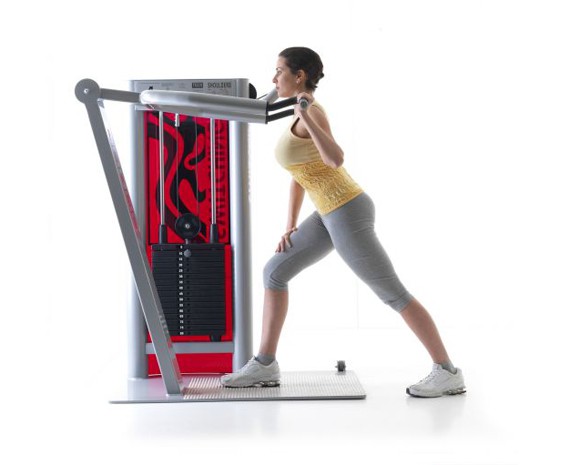 Этот силовой станок позволяет проводить функциональную тренировку в вертикальном положении. Жим от плеч выполняется стоя, когда одна нога расположена немного перед другой. Целевое упражнение на силовом тренажере SW04 бренда Teca можно видоизменять, выполняя его, стоя на одной ноге, или выполняя жим одной рукой.