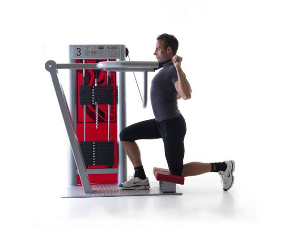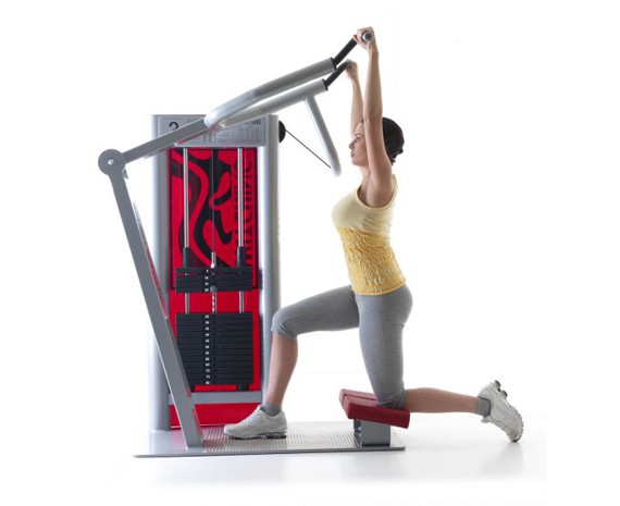 Силовая машина позволяет проводить функциональную тренировку в вертикальном положении, с упором на мышцы спины. Рукоятки тренажера сводятся к высоте плеч до положения прямо перед плечами, когда пользователь стоит на коленях. Целевое упражнение на силовом тренажере SW03 бренда Teca можно видоизменять, убрав колено с опорной подушки или выполняя тягу одной рукой.