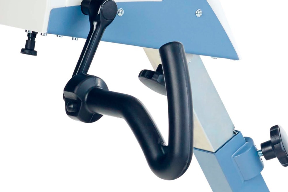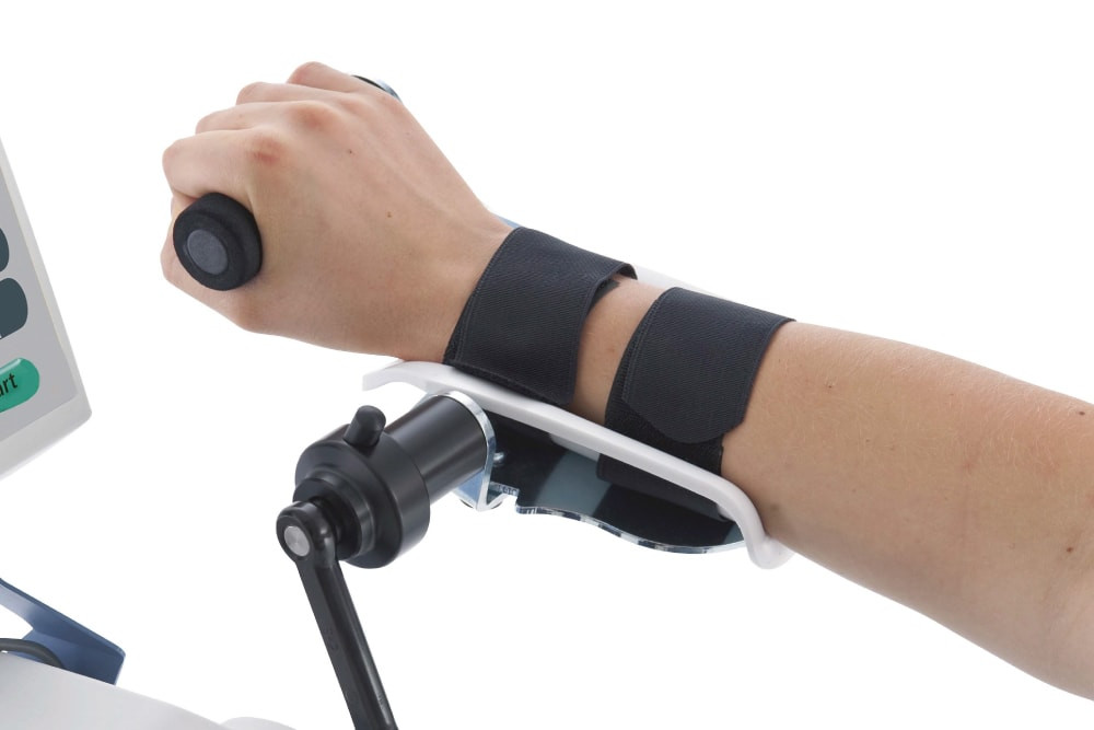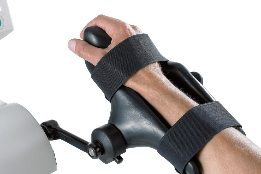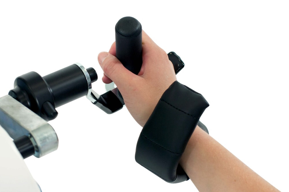 Терапевтические ручки и подлокотники Терапевтическая рукоятка с тремя видами хвата позволяет сохранять удобное положение во время тренировки. При отсутствии хватательной функции, можно закрепить руки пациента на специальном упоре/подлокотнике. Это лучший способ обезопасить тренировку пациента с парализованными или слабыми руками. Все терапевтические рукоятки и подлокотники легко моются и их можно заменить без использования специальных инструментов.