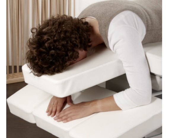 Головная часть кушетки включает три особых элемента. Для носа предусмотрено специальное отверстие. Положение головной части можно изменять гидравлическим способом в пределах от 30 градусов вверх до 60 градусов вниз. Слева и справа от кушетки встроены мобильные ярко-серые подлокотники, которые существенно расширяют возможности головной части.