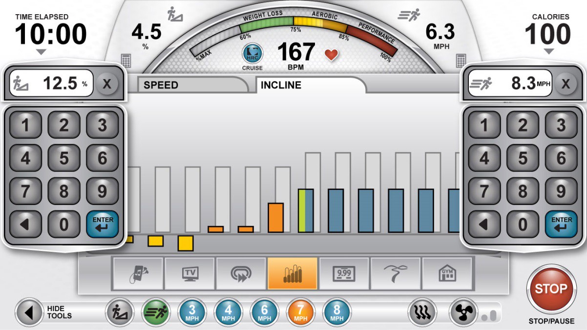 Простая и понятная в управлении многофункциональная консоль Transcend16 имеет 16-дюймовый сенсорный экран с дополнительным LCD экраном, куда выводятся все тренировочные параметры. Сервисные возможности консоли позволяют делать самодиагностику и осуществлять системные обновления через USB. Энергосберегающая технология имеет три режима. Большое количество программ позволяет проводить разнообразные и высокоэффективные тренировки. Система контроля пульса, которая включает сенсорные датчики и беспроводной пульсрметр, позволяет следить за состоянием организма в процессе тренировки.