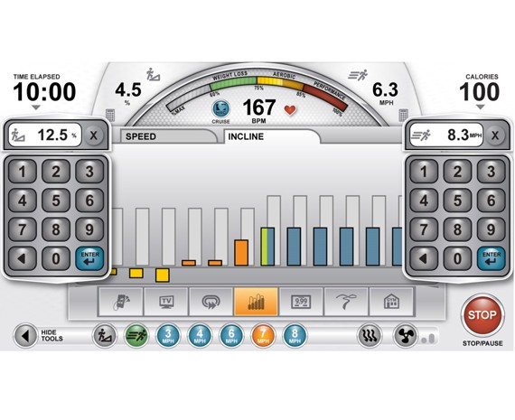 Велотренажер оснащен простой и понятной в управлении многофункциональной консолью Transcend16, которая имеет 16-дюймовый сенсорный экран с дополнительным LCD экраном, где отображаются все параметры тренировки. В сервисных возможностях консоли предусмотрена возможность осуществлять через USB системные обновления и делать самодиагностику. Обширный программный пакет обеспечивает возможность проведения разнообразных и высокоэффективных тренировок. Система контроля пульса обеспечивает в процессе тренировки контроль за состоянием организма. В нее входит беспроводной пульсрметр и сенсорные датчики, установленные в рукоятях велотренажера.