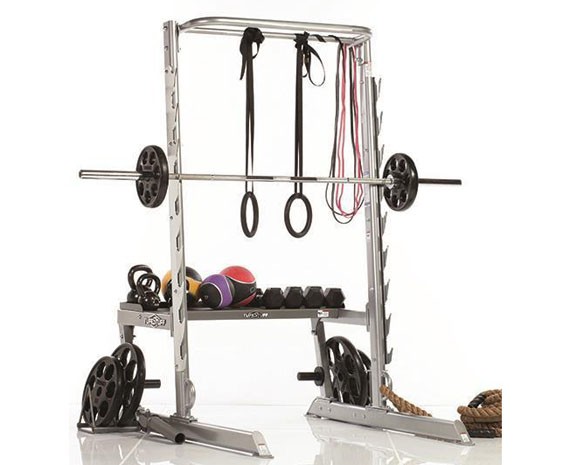 Большой держатель для олимпийского грифа обеспечивает свободное место, не занимая вертикальные держатели, а также выступает в качестве надежного крепления канатов для выполнения упражнений.