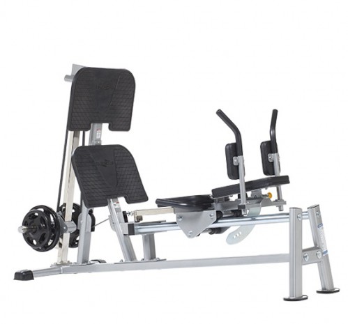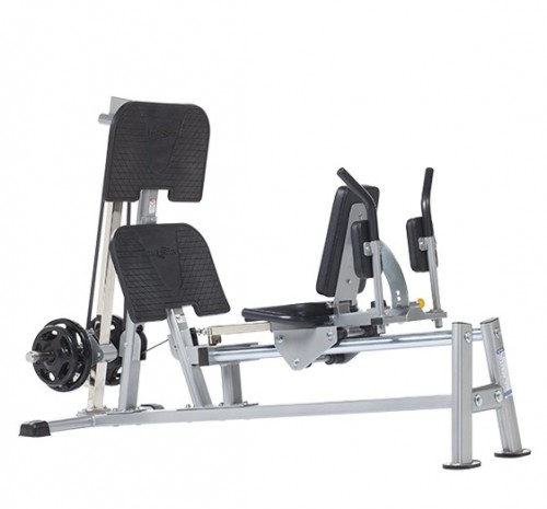 Тренажер «два-в-одном» имеет уникальную конструкцию и позволяет выполнять два упражнения – жим ногами сидя и гакк-присед лежа.