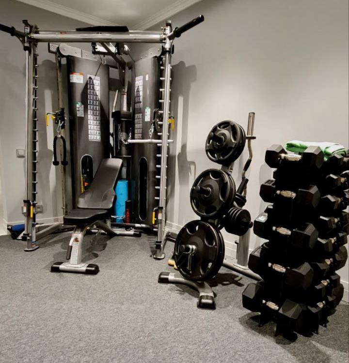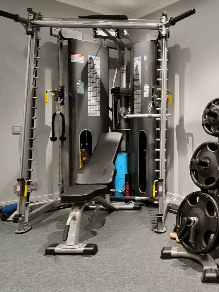 Угловой кроссовер с Машиной Смита TUFFSTUFF CXT-200&CXT-225, скамья и свободные веса в интерьере