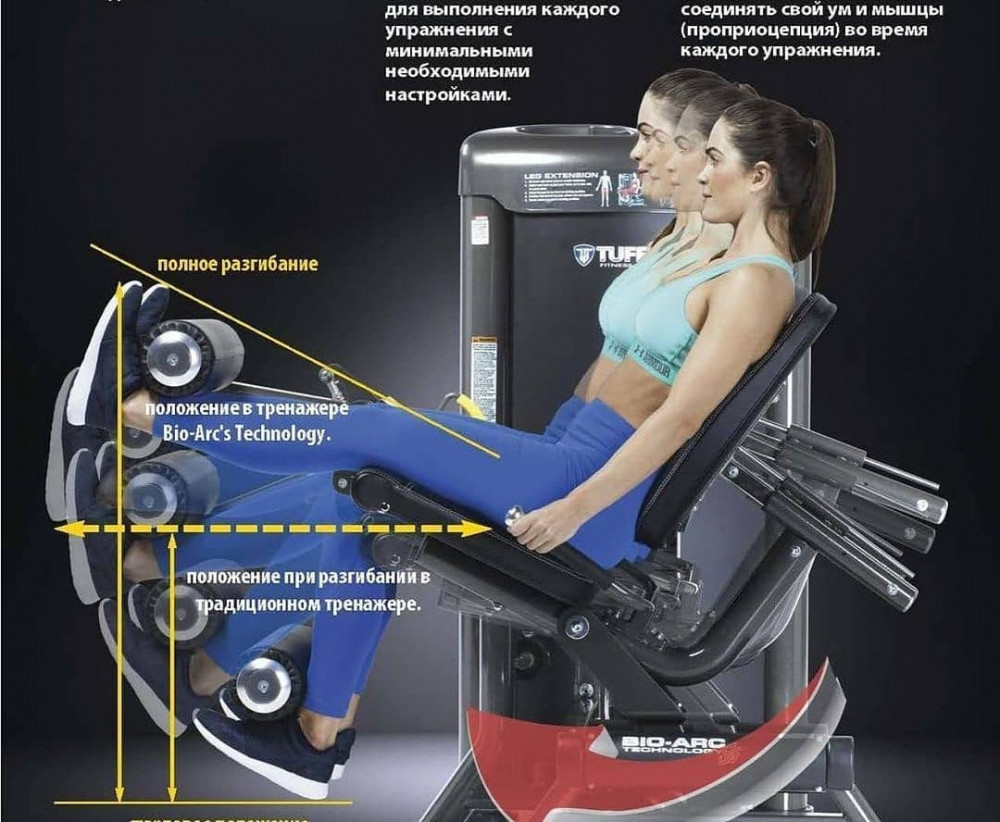 На фото TuffStuff Bio-Arc Leg Extension (BA-707). Он специально разработан и протестирован для обеспечения оптимальной биомеханики. В результате получился тренажер, который поддерживает угол бедра / наклон таза для оптимизации длины мышц во всем диапазоне движений.