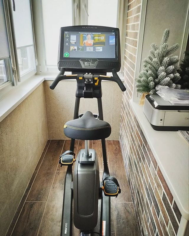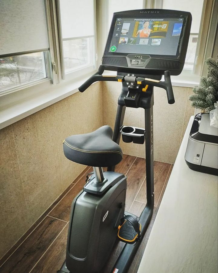 Хозяин пространства на представленном фото точно осознал свои потребности и сделал выбор в пользу вертикального велотренажера Matrix U50XUR с 22-дюймовым ярким сенсорным HD-дисплеем, Wi-Fi, усовершенствованным Bluetooth-модулем для синхронизации оборудования с приложениями на мобильных устройствах, HDMI-портом, благодаря которому можно подключить любое цифровое мультимедийное устройство к консоли.