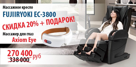 В период по 31 декабря 2015 года действует скидка 20% на массажное кресло Fujiiryoki EC-3800. Кроме того, в подарок (абсолютно бесплатно) Вы получаете массажер для глаз Axiom Eye, розничная стоимость которого составляет 12 000 руб!