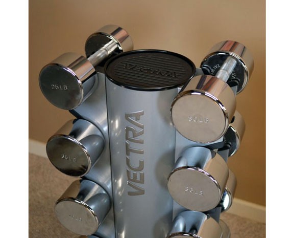 Вертикальная подставка под гантели DB5 бренда Vectra Fitness обеспечивает удобный доступ к спортивным снарядам.