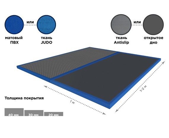Для покрытия татами высококачественный ПВХ от ведущих мировых производителей, который по своим качеством намного превосходит дешевые аналоги из Китая. Для изготовления покрытия может использоваться матовый ПВХ или ткань Judo.