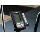 Монитор с LCD-экраном, на котором отображаются различные параметры тренировки: дистанция, калории, мощность, пульс, время и скорость.