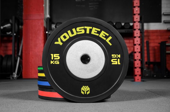 Соревновательный черный каучуковый диск весом 15 кг бренда YouSteel оформлен желтым логотипом на черном фоне. Такое цветовое сочетание выполнено в соответствии со стандартами тяжелой атлетики. На торцевой поверхности диска имеется вдавленная в резину желтая линия, с помощью которой обеспечивается удобная идентификация данного веса. Маркировка отличается очень высоким качеством, и сохраняется в своем виде в процессе эксплуатации.