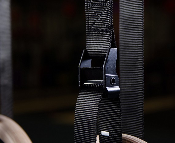Стропы фиксируются прочным замком, что является гарантией того, что гимнастические кольца D32мм бренда YouSteel не изменят своей высоты в процессе работы с ними.