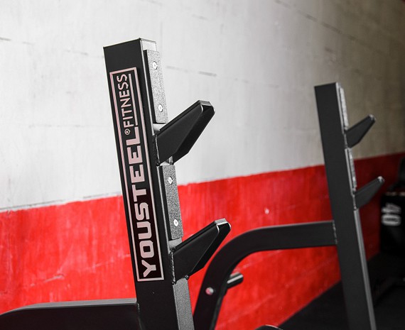 Конструкция стойки рассчитана на большой вес и обеспечивает комфорт пользователям разного роста. Стойка имеет две пары мощных держателей для штанги, расположенных на разной высоте.
