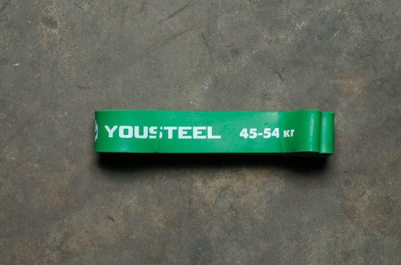 Power Bands различаются шириной и степенью сопротивления, и в зависимости от этого резиновые петли имеют различную окраску. Резиновая петля для тренировок Power Band 44 мм бренда YouSteel сопротивлением 45–54 кг имеет окраску зеленого цвета.