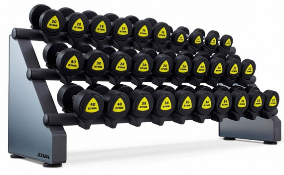 Стойки компании Ziva предназначены для хранения свободных весов. Горизонтальная загрузка наиболее удобна для пользователя, так как позволяет быстро выбрать необходимый вес гантелей. Гнезда для гантелей расположены под наклоном вперед. Устойчивая стальная конструкция способна выдержать вес 15 пар гантелей. Для того, чтобы избежать вмятин и царапин на напольном покрытии, были предусмотрены силиконовые ножки. Порошковый метод окраски позволяет изделию сохранить первозданный внешний вид долгие годы.